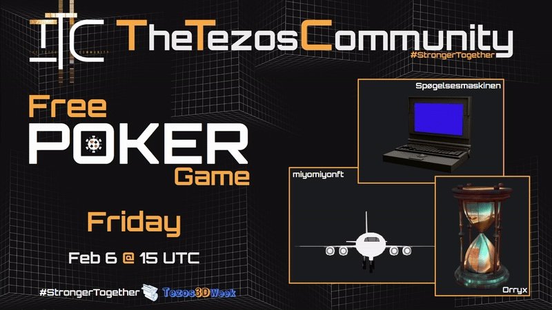 Local Time Timezone: America/Chicago Date: Feb 06 2026 Time: 09:00 Location Discord Category Community Events Giveaway URL: https://discord.gg/K8D9hxPaBr Date Feb 06 2026 Time 15:00 Free Poker Game at TTC Every Friday you can join a free game of Poker in the Discord of TTC! It’s open to everyone who joined the Discord and with prizes for the top 3 players! Places to stay up to date with TTC: X Farcaster Discord Homepage Share this event + Add to Google Calendar + iCal / Outlook export Tags: free, game, poker, prize, TheTezosCommunity, TTC
