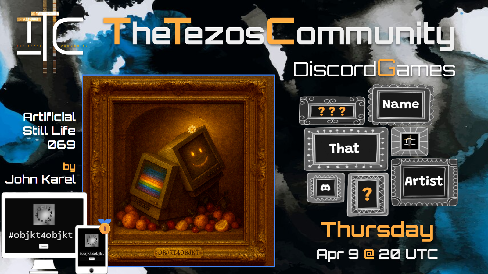 The game fetches real NFT data from objkt.com and runs timed, multi-round competitions with scoring based on speed and accuracy,