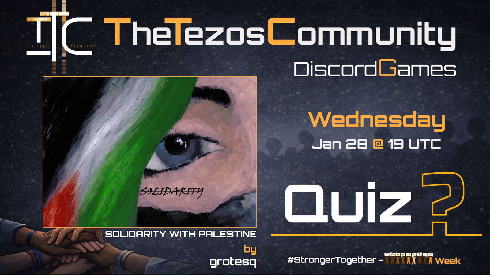 Local Time Timezone: America/New_York Date: Jan 28 2026 Time: 14:00 Location Discord Category Community Events URL: https://discord.com/invite/K8D9hxPaBr Date Jan 28 2026 Time 19:00 Quiz Day at TTC #72 | Community Week 🫂 Join a fun quiz in the TTC Discord and test your knowledge about everything and nothing! Places to stay up to date with TTC: X Farcaster Discord Homepage Share this event + Add to Google Calendar + iCal / Outlook export Tags: free, game, prize, quiz, TheTezosCommunity, TTC