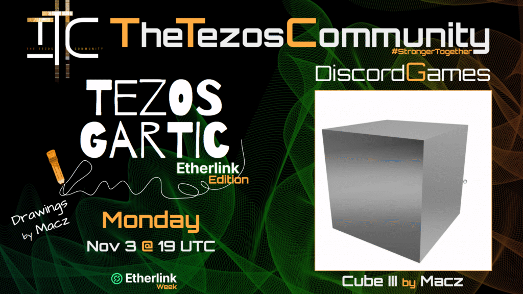 Local Time Timezone: America/New_York Date: Nov 03 2025 Time: 14:00 Location Discord Category Community Events ContestGiveaway URL: https://discord.gg/K8D9hxPaBr Date Nov 03 2025 Expired! Time 19:00 Tezos Gartic #21 | Games on @etherlink Come join us for the 21st Tezos Gartic game, Monday at 19:00 UTC at the @TheTezos Discord server!! Today’s Theme: Games on Etherlink The winner will receive “Cube III” by Macz StrongerTogether 🎨 Etherlink Week Places to stay up to date with TTC: X Farcaster Discord Homepage Share this event