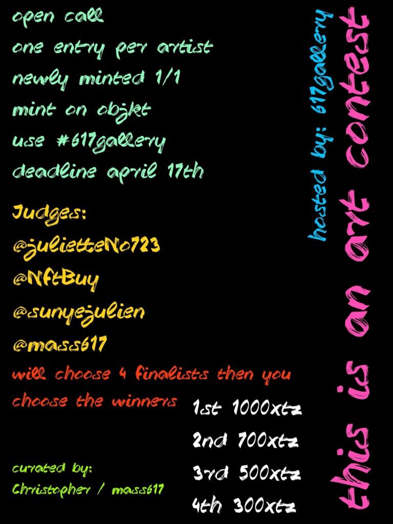 Open call. One entry per artist. Must be a newly minted 1/1. Mint on objkt. Use the tag #617gallery. The deadline is April 17th.