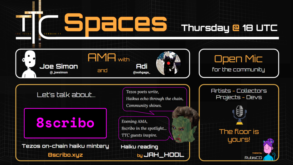 Let’s find all about the on-chain haiku mintery platform they’re building on Tezos and their plans for the future! And @jamesalechardy will pop in to recite some haikus live to us 🔥 Visit 8scibo.xyz, check out the haikus minted and if you’re feeling inspired, why not create and mint one too?