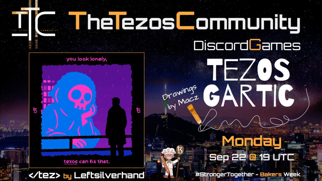 Come join us for the 18th Tezos Gartic game, happening today at 20:00 (19:00 UTC) at the @TheTezos Discord server!! Today’s Theme: Seoul, the 19th Tezos protocol upgrade Tezos Gartic prize by S @leftsilverhand Discord Winner: </tez> 🔗 https://objkt.com/tokens/KT1JtCH2x2R9nNzLxDYgU6Anc3JYWWA6RggT/4 StrongerTogether 🍞 Bakers Week – September Places to stay up to date with TTC: X Farcaster Discord Homepage